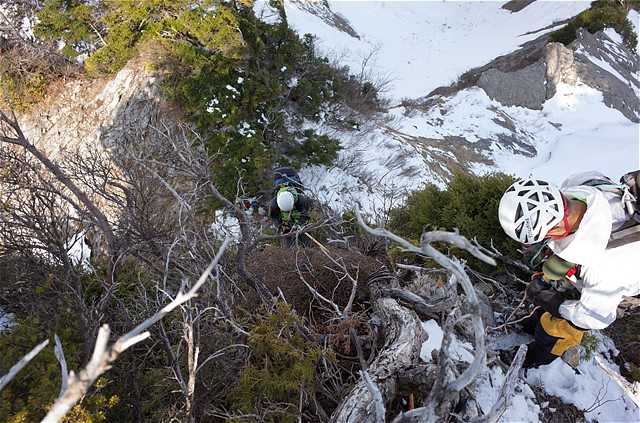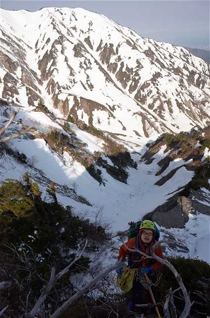 残置スリングのある潅木は枯れている。その木を支点にしようとしたCLであるが、止めさせた。