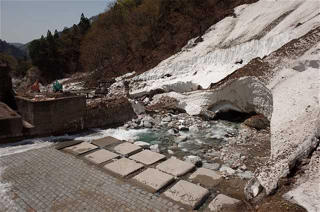 13:13 出発。取水口右岸は雪の斜面となっており、アイゼンがまだ必要であった。軟雪だったのでキックステップで通過した。