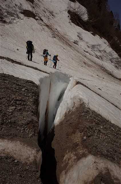 ストックをピッケルに変える。雪渓の割れ方が大きい。