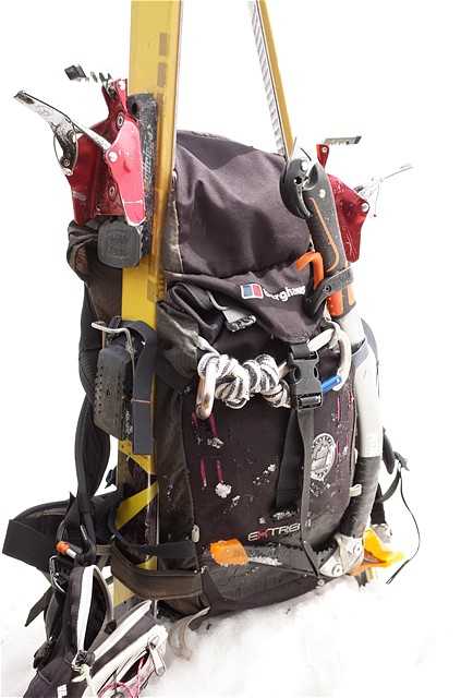 30リッターのバックパックに、130cmの板を付けて登った。板が軽いから苦にならない。
