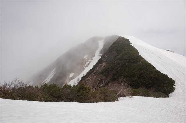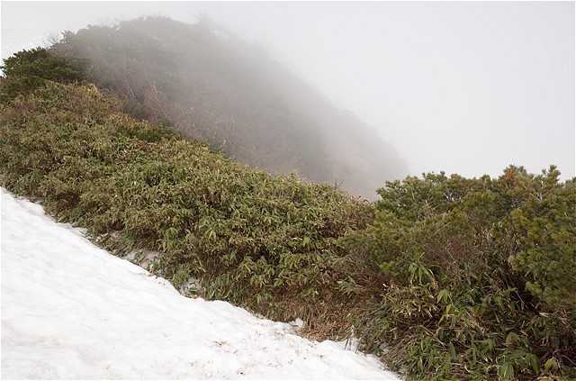 毛勝谷側は寒くて我慢ができない。稜線側に逃げる。冷えた指先を鼠径部で温める。霧が薄くなる気配はない。