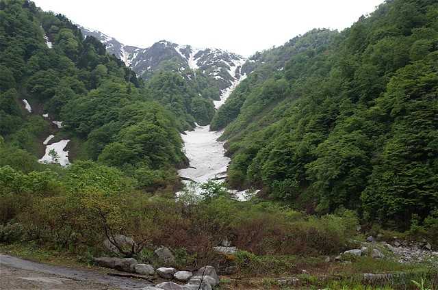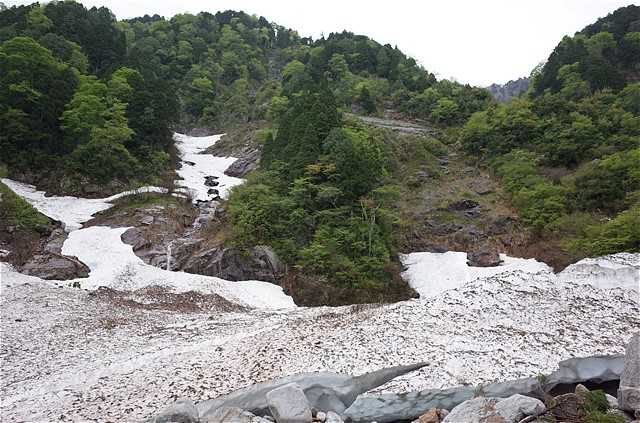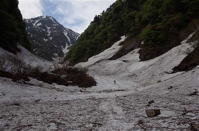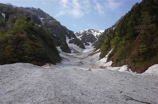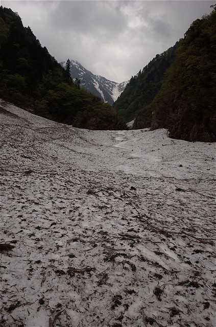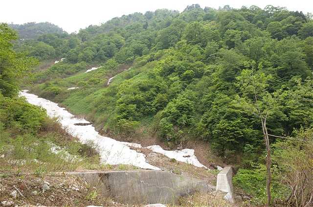 6:41 1031m 阿部木谷の最終堰堤。額に手拭いを巻いているのに、汗がボタボタと流れ落ちてくる。ここから谷の中は雪がべったりだ。