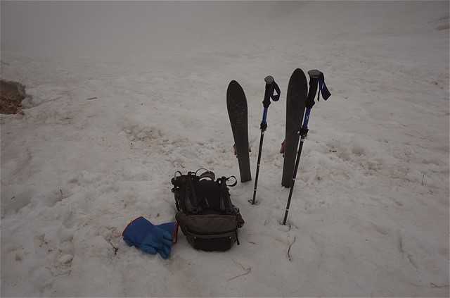 南峰を偵察していたスキーヤーが仲間を見にコルに降りてきた。しばらくしてスキーヤーが霧の中から現れた。大きな落石に遭遇してヒヤヒヤだったそうだ。