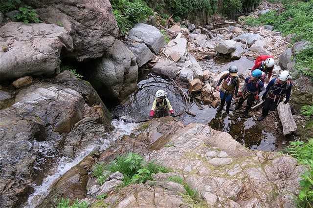9:21 滝場のクライムダウンは岩をよく見ればホールド多数。ぬめりは強いので慎重に。