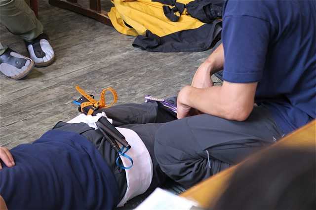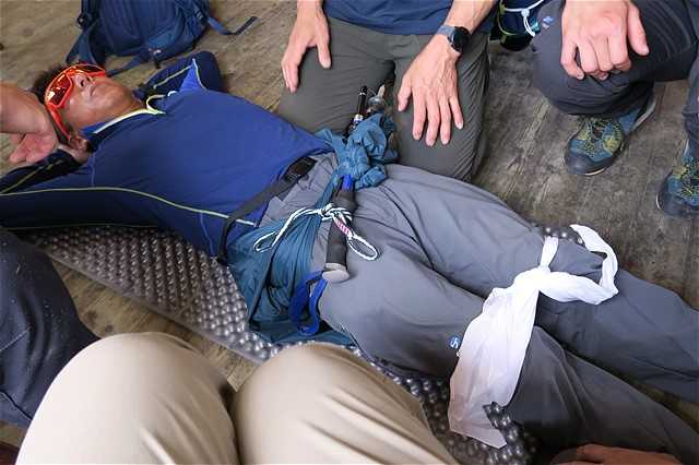 サムスプリントがない場合は、雨具を帯状に畳んで骨盤に巻き、両袖を縛る。