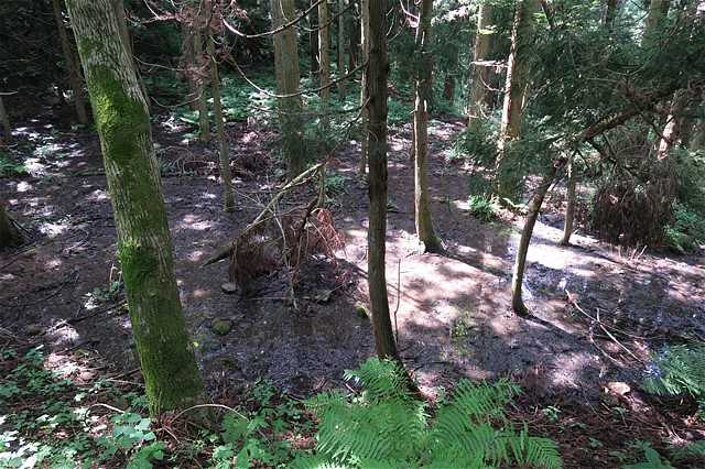 強行突破でトレイルを発見。日陰で涼しい。地面はふかふかで足に優しい。