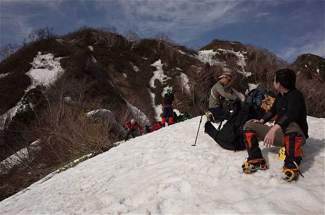 休憩、汗だく。山行3日目くらいの疲労度だ。