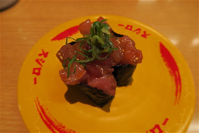まぐろユッケ。むすめのお勧め。やまやろうも昔から好んで食べていたネタ。一時期いまいちだったが、卵黄醤油で味が改善した?