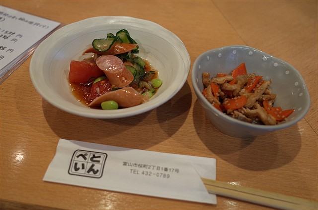 付出し(2品)。これで330円。大したものも出さないのにしっかり席料を取る店もある中で、2品も出してくれるのは良心的。これだけでも結構酒が飲めてしまうものなのだ。