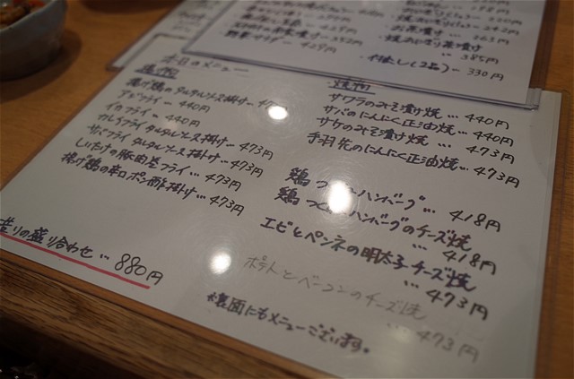 メニューその2。本日のメニュー。ビールにも日本酒にも洋酒にもピッタリなつまみが豊富に揃っている。
