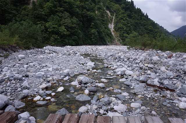 10:28 登山口。立山川の橋のたもとの石に腰かけて、涼風を浴びる。この先馬場島まで長いが、ちんたら歩くことはせず、走る。