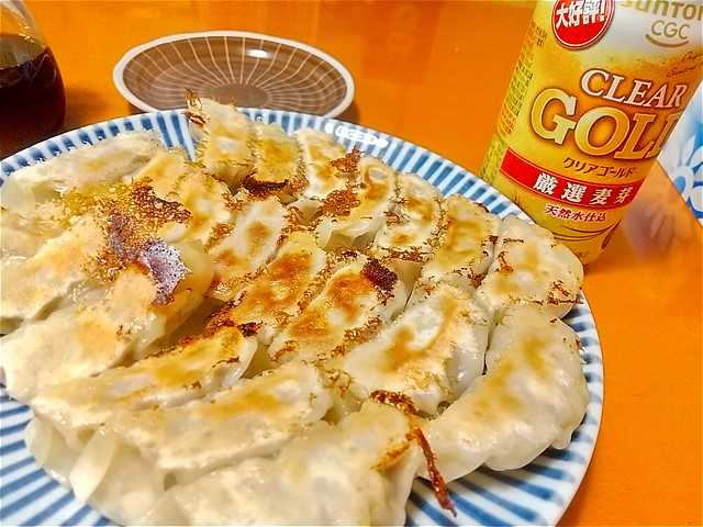 焼き立てをビール系とともに頂く。うまいわー。フライパン2枚を使って、どんどん焼き上げていく。餃子は147個作ったそうだが、全て5人の胃袋に収まった。