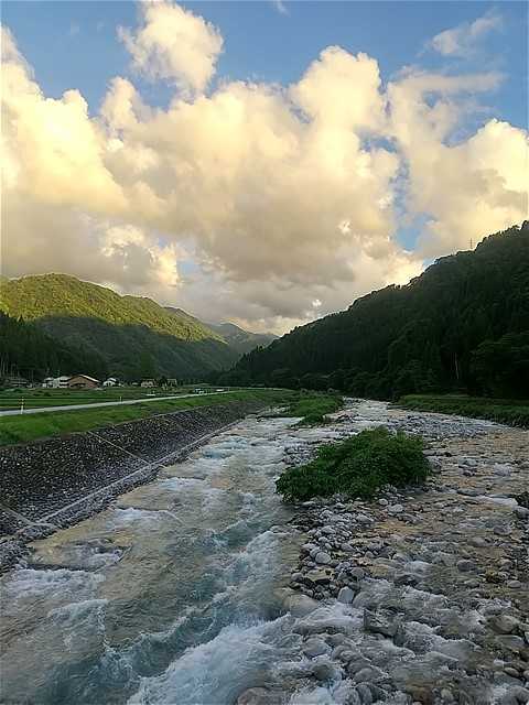 片貝川上流へ向けて走り出す。正面は大杉山。やまやろうが魚津に来た25年ほど前は、ぶどう原と言われる拓けた斜面があった。冬はそこで スキーができた