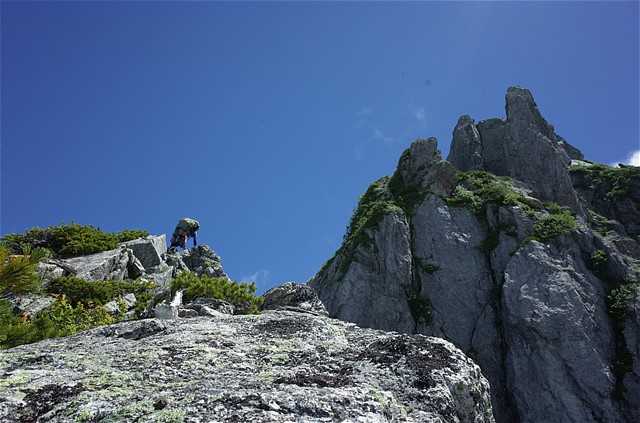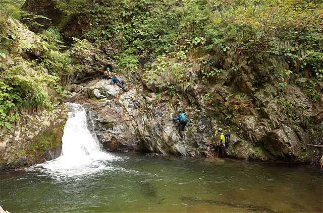 4:00 目覚ましが鳴る。昨夜は仲間から酒をもらいまくって飲み過ぎた。シュラフカバーとダウン上下で少し寒い程度(よく寝られた)。変な夢をたくさん見た。テント内は13.8℃。再び熾した焚火に当たりながら朝食を摂る。あんぱん2個。持参したアルファ米は、夕食も朝食も食べなかった(食欲がない)。温かい日本茶は2杯飲んだ。水分は多く摂っておく。5:34 1900m テントを撤収して遡行再開。沢の中はすっかり明るくなっている(日差しはまだない)。気温13.5℃。5:44 分岐。右手の第一核心部に入る。ここの滝はフリーで越える。6:13 奥の二又。焚火の跡が残っていた。右岸の上方斜面に大きな岩屋みたいなものがある。昨日は少し頑張れば、ここまでは来られたかもしれない。第二核心部に入る。ここではお助けロープを出してもらった。残置ハーケンがあった。6:44 大滝が現れる。下部のチョックストーン越えはザックを引き上げてもらい、お助けロープを使った。滝が直角に曲がった上部が核心部。残置ハーケンあり。10年前にS竹、山ちゃんペアがロープを出したところだ。N村さんが上部工作に出る。自分は最下部で待つ。上部で何をしているかは見えない。30mのロープを出して潅木に支点を構築した後は、50mロープで上部の滝を工作している。8:10 やまやろうラストで下部の登攀終了。上部の滝は右岸から。岩が外傾していて登攀難易度は高い。8:27 上部の滝を越えた(第二核心部終了)。日差しに包まれる。8:36 眼前に滝が現れたところで休憩。振り返れば大日岳と弥陀ヶ原が見える。8:47 休憩後に出発。8:55 大滝は左岸の段々から、N村さんがロープを伸ばす。Nさん登攀中。9:25 登攀終了。もうロープは要らないだろう。水線を攻めるNとさん。プールに浸かってニッコリ。この先は天国のような風景の中を歩く。草黄葉が始まっている。10:10 2450m 流れが細くなったところで登攀装備を解除する。沢靴をアプローチシューズに履き替える。ここで水を1L汲む。稜線までは標高差がまだ200mほどある。10:46 出発。細い流れをたどり、ザレ場を詰めてハイマツとササの斜面に出る。ところどころでハイマツのヤブを漕ぎながら、登山者の歩く稜線を目指す。11:28 2680m 薬師岳の登山道に合流する。気温21.9℃。自分以外の5人は空荷で薬師岳山頂を目指す。11:39 単独で下る。足袋靴なので足の置き方に気を遣う。運良く槍ヶ岳が見えた。12:00 薬師平を通過。12:24 太郎平キャンプ場(クマ出没により閉鎖中)。12:43 太郎平小屋。ここで後続を待つことにした。1時間ちょっとで、左手の白いピーク付近からここまで来れたのだ。カレー並盛1300円と缶ビールロング1100円を購入する。どちらも胃に染み渡る旨さ。値段は高いが不満はない。全身の衣類が濡れているので身体が冷える。雨具を着る。周りの登山者は半そでや短パンなのに、自分だけ浮いた格好だ。13:55 N村さん、mさんが到着。お昼の注文受付終了の5分前だった。14:01 Nとさん到着。14:08 Dさん、T中さん到着。売店前のベンチでめいめい食事を摂る。14:36 下山開始。有峰湖が輝いている。15:46 休憩なしで三角点まで来た。かなりきつかった。16:54 登山口到着、23.8℃。ラストはふらふらになった。またも脱水症状か?自販機コーラ250円をグイっと飲んだが、あまりありがたみを感じない(身体が受け付けない)。17:15 車に乗る。17:43 駐車場に到着。車座になって反省会をして解散。