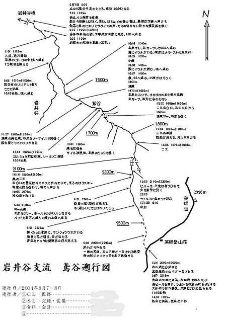 昨日のブログで、ランニングは登山のトレーニングにはならない、と書いた。すかさずフェイスブックつながりの方から反論された。単純に、あなた(やまやろう)の努力不足ではないですかと。ぐうの音も出ない。おらなんて走っていない方だ。夕方に多くて週に2、3回、小一時間走っているだけで、なーにがランニングなのだ。月間200km走れとか、年間3000kmを目安にせいとか言われた。やっている人は、それくらいがフツーなんだろうな。ちなみにやまやろうのブログに反論された方は、ガチな山屋であったりランナーであったりするので、こちらは全くもって言うことに従うしかない。やまやろうは、努力が足りない。5.9の男とか自虐しているが、雑穀谷で練習していないからクライミングができないのは当たり前。荷物を担いだ例会山行でヘロヘロになるのも、歩荷訓練をしていない(そもそも山に登っていない)から当たり前。うまくいかなかったことは努力不足なだけなのに、ランニングには意味がないとか文句を言うのはちゃんちゃらおかしい話だ。若い時は何も訓練せんでも人より速く登れた。そのおごりが訓練を怠ることとなり、今の凋落につながっている。モチベーションの高い人は、こっそりと確実にトレーニングをしているのだよ。ブログなんて書かずに。この歳になると、若い時はあれを登った、どこそこを滑ったという話になりがち。そればかりになると、その人はオワコンですね。自分はもうそうなりかけている。会心の山行ってぇのができなくなっている。山行をしていても楽しくないのだ。同じ鳶谷を登っていても、楽しいと思えるmさんと、つらたんのやまやろうでは何が違う?山へのモチベーションや興味、道具や技術への探求心などが、ことごとく低下している。若い人には追いつけないという諦めが強いのかな。N村さんとかo谷さんとか、Dさんとか松っつあんは、自分よりも年齢が上だが、バリバリ活動しているし、体力気力もある。もう追いつけない。自分は何をしているのだろう。変わりたい。後ヨタです。鳶谷の遡行は3回目です。最初に入渓したのは、2004年8月であります。野郎2名とギャル2名での遡行!!これが当時の遡行図です。記録魔のやまやろうが残しておりました。記録では、8:13に岩井谷の橋とある。9:55に鳶谷の出合い(1390m)。12:14に標高1650mでソーメンを食べている。16:10に奥の二又。核心部の滝は右岸の際を巻いている(2025年は左岸)。19:30に2250mでビバークしている。ツェルトに包まって寝た。5:44のこの滝は、2025年と同じく左岸を越えていたかもしれない。右岸の水流際を登攀したってのは、おらの妄想かもしれませんすいません(記憶は後から作り変えることができる)。8:24に登山道に合流。9:57に太郎平小屋。11:08に出発して、14:50に折立。ロープなしとか言っていたが、滝場でちゃんと出してました。人間の記憶は、武勇伝側に歪むようだ。