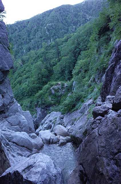 4:00 起床。ハスラーでスーパー農道を走る。5時過ぎに大山歴史民俗資料館の駐車場に到着(一番乗り)。6人が車2台に分乗して、有峰林道の6時のゲート開放を待つ。すでに数十台の車列がある。6:13 ゲート通過(通行料金2000円)。6:44 折立キャンプ場前は満車なので臨時駐車場まで300m進んだ。6:58 駐車場出発。気温17.8℃、ザック重量15kg。折立ヒュッテトイレで用を済ませる。7:12 林道真川線を歩き出す。アプローチシューズは足袋靴とした。自分が先行して黙々と歩き続ける。みんなは楽しそうに会話をしている。自分はCLとなったプレッシャーから精神的に追い込まれていた感がある。8:13 岩井谷出合い。沢靴に履き替え、ハーネスやヘルメットなどを装着する。8:34 遡行開始。右岸の踏み跡を使い、堰堤を3回越える。晴天が続いていたので水量は少な目。9:25 分岐を右へ進む。9:45 日陰で休憩する。汗が異常に出て止まらない。岩の上でぐったりしていた。10:37 休憩。バテバテ。あまりにも状態がひどいので。50mロープとハーケンを持ってもらうことにした。水の透明度は高い。11:18 1580m 大岩の滝が現れる。11:30 右岸の高巻き開始。踏み跡は明瞭である。11:57 滝場に出る。くの字に曲がった渓の先の滝。左岸をフリーで越える。12:08 バンド状の滝が現れる。休憩。足が出ない。体調ヘロヘロ状態が回復しない。写真を撮る余裕がない。荷物が軽くなって、ようやくみんなに付いていける感じだ。岩井谷から鳶谷に入っていることに気づかなかった。ここもフリーで。13:40 幕営地を探しながら遡行する。13:54 時間的には早いがテントを設営した。この先は連爆帯に入り、幕営地が限られてくるのだ。泊まったのは下部二又の下流である。遡行時に着ていたものは濡れていたので、全て着替えた。日差しで温かくなっている岩の上に、濡れた衣類を置いて乾かすことにした。焚火用の薪を集める。平坦地は少なく沢の中にテントを張った。スペースがないので左岸と右岸に分かれた。50mロープを渡す。T中さんはタープで寝るとのこと。右岸のテントは大岩の上で不安定だったので、3人が入れるか微妙だったのだ(Nとさんとやまやろうで使用)。釣り竿を持ってきていたのでルアーを投げてみる。下流では魚影があったようだが、ここはもう大滝の上なので魚が棲んでいる気がしない。数回ルアーを投げて諦めた。幕営のためにやることがあるのだ。15:00 左岸のテント前で酒を飲み始める。こちらの方が薪を集めやすかったのだ。自分は着火剤(カンバの皮)を持ってきたが、N村さんの牛乳パックの方がよく燃えた。焚火係のやまやろうは、一発で着火させた。今回の遡行で唯一、人並みのことができた。辛口一献600mlを持ち込む。やっぱり日本酒だよねー。冷やしたいけれど常温で飲んだ。遡行時のヘロヘロ状態は、脱水症状だったのかもしれない。めいめいつまみを出す。16:15 キャベツたっぷりなケイちゃん焼きが登場。夕食の鍋も作り始める。見上げる山並みは、ガスに包まれた。虫はおらず快適。夕食は豚肉たっぷりの鍋。それをつけ汁のようにして、沢水で締めた氷見うどんを食べる。お代わりあり。行動終了は早かったかも。明日の行程は長くなる。自分がヘロヘロだったせいなのだが。T中さんのいいちこ、Dさんのハイボールをいただく。眠たくなってきたわ。食後は焚火の前で語る。mさんの衝撃の昔話が記憶に残る。あとはNとさんが企画する海外旅行が気になるわ。19:33 シュラフカバーに入る。上下ダウンを追加する。