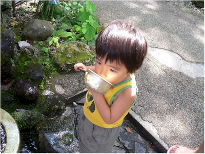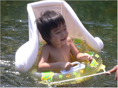 今日は旅行最終日。まぁ明日も休みだからのんびり帰る予定だけど、今日は何しようかなぁ?家に帰る方向で楽しそうなところがあったら寄ろうと言うことになりました。福島県のウサギの森キャンプ場から塩原方面へ向かう途中、昨日馬車に乗ったそばに鍾乳洞があるということで行ってみました。源氏の誰かがこの鍾乳洞に隠れていて、鍾乳洞の中で米をといでいたら、川にとぎ汁が流れて見つかってしまったとかいう内容だったと思うが、とにかくひどい!!!入場料600円もとったくせに、距離も短くてすごいって思わせるようなところがひとつも無かった。鍾乳洞の外に「長生きする水」?だったかなぁ?そんな名前の湧き水があって、とりあえず家族全員で飲んでいきました。唯一、水はおいしかった。さて、気を取り直して次はどこに寄ろうかなぁ?って思っていると、道路沿いにきれいな川が見えてきました。今回の旅行で遥人に川遊びをさせてあげられなかったので、川に入れる場所は無いか探していると、人が川に入っているのを見つけて行ってみました。すると、川に下りられる場所を発見して、しかも駐車場もあったのでこの川で少し遊んでいくことにしました。とりあえずちょっと遊ぶ予定だったので、遥人は洋服のまま川に入れてしまいました。でもこの川意外と深くて一緒に遠くまで行けないので、急遽パパも遥人も水着に着替えて本格的に川で遊ぶことにしました。この川、深いところではパパの胸の辺りまであって、遥人は足が届きません。そして何より冷たい!!!遥人は唇を震わせながらも楽しそうでした。そんなことで、川で遊び終えてからは結構疲れてしまったので、後はどこにも寄らず帰ることにしました。今回の旅行は宿とかあまり決めないで行ったんだけど、結構楽しかったなぁ。遥人も璃杏も楽しかったようだったので、また連れて行きたいなぁ