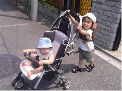 今日は昼間に遥人の希望でお散歩に行ったようです。今日は暑かったから、二人とも帽子かぶってお出かけです。どこに行くのかな?空堀川の川沿いをお散歩したようです。それにしても遥人は何でおサルのリュックをしょってるのかな?一人で走ってどっか行っちゃわないようにしょってるのかな?それにしても最近久しぶりに見たから何だか懐かしい感じ・・・璃杏は気持ちよさそうにお昼寝です。どうやら遥人はお散歩して公園で敷物を引いてそこでご飯を食べたかったらしいのだが、公園が雑草に覆われていて座れなかったので、結局コンビニでお弁当を買って家でお弁当を食べました。その後遥人が璃杏を抱っこしてハイ!ピーズ!!!