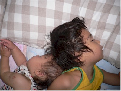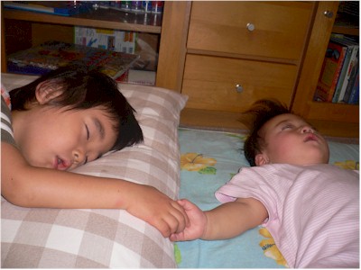 今年の夏風邪は半端じゃない!!!いったいどんだけたてば治るんだろう?この2日間ブログの更新が出来なかったのは、ついに風邪が自分に回ってきてしまい、熱を出してダウンしていたからです。今日は朝まで熱があったんだけどようやく熱も下がって楽になってきました。まだ咳が止まらないけど・・・遥人は完全に治ったけど、璃杏はまだ鼻水と咳が続いており、昨日はまた吐いてしまった。そしてママもまだ鼻水が続いている。そうそう、璃杏は3日まで高熱が続き、3日に病院へ連れて行って採血をし検査をしました。その日に病院の紹介状をいただき、何かあったらすぐに紹介状をもって病院へ行って下さいって言われました。心配していたんだけど、土曜日に熱が下がりました。病院へ検査の結果を聞きに行くと、ウィルス性の風邪ということが判明しました。とりあえず、先生からは熱が下がったので様子を見て、薬をあげ続けて下さいと言う事でした。それで、とりあえず熱は下がったけど今日までまだ引きずってます。パパの実家へ今日は遊びに行く予定だったけど、今日はキャンセルしました。ババがハワイへ行っていたので、そのお土産があるということですぐにでも行きたいんだけど、この状況じゃいけないなぁ。風邪をうつしても大変だし!今年の夏はまだ夏らしいことを全くやっていません。梅雨明けも遅かったし、この1週間風邪でダウンしていたこともあったので。遥人は海に行きたくてしょうがないらしいので、この風邪が完全に治ったら、海とかキャンプとかの企画をしよう!!!このまま夏が終わってなるものか!!!先ほどママが寝るときに、遥人と璃杏がかわいい寝方しているって言うので見に行ってみると、二人で背中をくっつけてねていました。かわいいなぁ