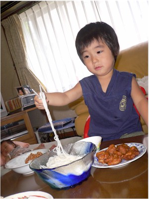 今日のお昼ご飯はそうめんでした。っていうか、最近暑い日が続いているので、そうめんとかそばしかあまり食べる気がおきません。まぁ冷たくておいしいし、ダイエットにもなるのでいいかなぁ?さて、そうめんを食べるときに、遥人に箸をわたしました。すると箸で上手にそうめんをつかんで食べていました。上手にそうめんつかめたぞ!!!あれっ?今度は左手?おててが反対だぞ?テレビの前で小さく見えるけど、璃杏はお昼寝中です・・・