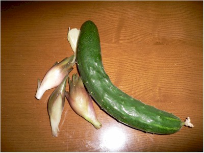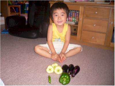 今日はとっても良い天気でした。何だか久しぶりの快晴って感じ?庭の畑はちょうど収穫時期になってきました。今日こんだけ収穫しました!!!白ピーマンが3個と緑ピーマン?1個とナスが3本、シシトウ1本です。この緑ピーマンですが予定ではオレンジピーマンのはずなのだが・・・これから色が変わるのに収穫してしまったようです白ピーマンははじめから緑色にはならないので、これでいいのかなぁ?ちょっと黄緑色っぽいけど・・・シシトウ片手に目をつぶって何を考えているのかな?そんなことしてると璃杏に野菜とられちゃうぞ!!!ほら!来たぞ!!!でも今日収穫した野菜は生でそのまま食べるものではないので、代わりにこれを!キュウリだよ!これこの間ジャガイモ掘りのときに収穫していただいたキュウリだよね!スティック状に切ってもやっぱり大きいなぁ!!!庭の畑ではようやくスイカが大きくなり始めました。このスイカの収穫が一番楽しみだなぁ!!!でもまだまだ収穫までは時間がかかりそうなので、我慢・我慢・・・