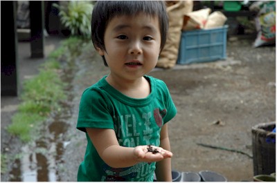昨日遥人と璃杏とママで、倖多の家に遊びに行ったんだけど、今日は倖多が我が家へ遊びに来ました。といっても外は暑いし、特に何して遊ぶでもないんだけど、まぁ我が家での遊びと言ったら・・・お風呂場プールです。外の駐車場にプールを作ってもいいんだけど、もともと蚊が多くて、なおかつ最近は野菜を作っていることもあり虫がたくさんやってくるし、紫外線も強いこともありお風呂場にプールを作っています。やはり3人だとちょっと狭いようだけど、楽しそうでした。今日は仕事から帰ってきてから庭の手入れをしていると、ミョウガが生っていました。そしてキュウリも1本出来ていたので収穫しました。ミョウガは冷奴に乗せて、キュウリはマヨネーズを付けていただきました。やはり取れたて野菜はおいしいなぁ!!!