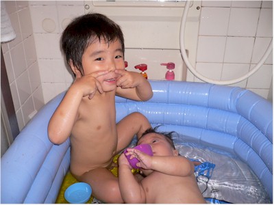 昨晩リビングのエアコンが壊れました・・・まぁ壊れたといっても水漏れしているだけなんだけど、修理が15日に来るのでそれまではクーラー無しの生活になります。この暑さの中ちょっとつらいなぁ・・・って思っていたら、ママはクーラーを使わないで、ほんとに暑くなったらお風呂場プールに子供達を入れれば大丈夫って言っていました。今日も最近の日課のようにお風呂場プールに入りました。水につかって二人とも気持ちよさそうでした・・・パパも入りたい!さぁて明日からの土日は何しようかな?先週は風邪でダウンしていたので、今週はどこかに連れて行ってあげたいなぁ?