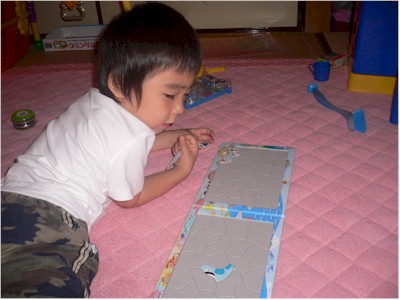 先週我が家がキャンプに行っている間に、姉と子供達が実家に遊びに来ていました。姉と子供の頌太・みなみは帰ってしまったんだけど、一番下のこころは一人で実家に泊まっているということで、今日ジジと一緒に遊びに来ました。ひさしぶりに見たこころはとっても大きくなっていて、なんだか別人のようでした。アンパンマンが大好きなようで、遥人のアンパンマンのおもちゃで遊んでいました。でもちょっとすると、遥人が最近はまっているパズルを始めました。遥人も一緒にやると言うことで二人でパズルをやっていました。遥人と璃杏とこころはそんな感じで遊んでいる中、パパとジジは世界陸上にはまり中。室伏のハンマー投げに没頭していました。室伏メダル取れなくて残念だったけど、ティホンはさすがだね!っていうか世界陸上がはじまってからと言うもの、完全にテレビっこになってしまっています。