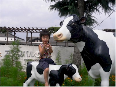 今日からパパは3日間夏休みをとりました。土日含めて5連休です。今日は朝7時に家族旅行に出発しました。今回の旅行の目的地は、全然決めていなくて、とりあえず1日目の宿泊先は那須塩原の箱の森プレイパークと言うキャンプ場です。(前日に予約を入れました・・・)高速道路を降りて、途中の道の駅で休憩です。最近旅行に行くと、道の駅を発見すると必ずと言っていいほど寄っていきます。地場野菜や特産品なんかを売っていて結構楽しいんだよね。今回寄った道の駅では、牛のオブジェが入口のところにあって、遥人が乗りたいって言うので、小さい方の牛に乗せて写真をパチリ!このあと大きい牛のほうにも乗せたんだけど、遥人はかなり怖がっていました。さて、この道の駅では地場野菜がとっても安く売っていたので、大根・ねぎ・アスパラを買いました。自宅を出たときはとても天気が良く、高速道路で向かっているときも晴れていたのに、キャンプ場に近づくに連れて天気が悪くなってきました。天気予報では確かにあまりよくない予報だったんだけど、とりあえずキャンプ場に着いたときには、あまり天気は良くないけど雨は降っていませんでした。キャンプ場についてすぐに、テントを張り始めました。とりあえず雨が降る前に全部作りたかったので・・・1時間くらいかかったかな?完成しました。夕方になって、やはり予想通り雨が降ってきました。今回は璃杏がまだ小さいこともあり、食事をするタープの中は椅子を置かずにハイハイして動き回れるようブルーシートとマットをひいておきました。でもこれが逆効果!雨が降ってブルーシートに雨が溜まってしまって床上浸水状態になってしまいました。途中で雨があがったので全部タオルで拭いてご飯を食べました。このあと遥人と一緒に花火をしました。遥人は花火とても喜んでいました。でも花火が終わるころまた雨が降ってきて、結局することも無いので、このままテントに入って寝ることにしました。この日はこのまま雨が降り続けました。とりあえず最悪の1日目になってしまいました。