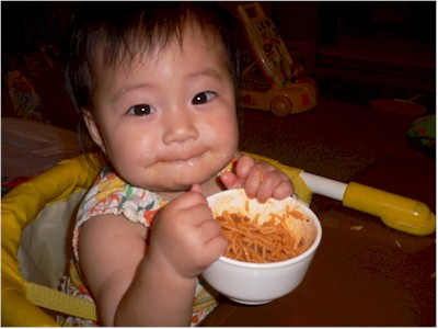 今日はご飯を自分で食べる練習です。まだちょっと早いとは思うんだけど、8ヶ月で既に3食完全に離乳食になり、ご飯大好きな璃杏だからちょっと挑戦させてみました。なぜか?写真を撮ると全部カメラ目線なんだよね。そんなにカメラ好きかい?今日はスパゲッティミートソースです。柔らかくないからちょっと食べ辛そうだったけど、手でつかんで食べていました。まぁほとんど下に落としていたけど、初めてにしては上出来だよ!!!これから少しずつ練習していこうね!