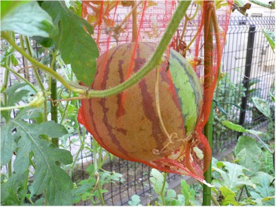 今日は1日休暇をとりました。遥人・璃杏・ママが全員で風邪をひいているため、子供達の面倒を見るために休みました。璃杏はあいかわらず熱が高く、何か食べたり飲んだりすると吐いてというのを繰り返しています。遥人はだいぶ調子も良くなってきているけど、まだ完全に治ったわけではなく咳もすごいし昼間はだいぶ昼寝をしました。ママも微熱ではあるけど、熱がなかなか下がらず、のどが痛くて頭も痛いって・・・なんなんだこの風邪は!!!夕方になって、どうやら最後の砦であったパパにもうつったようだ・・・鼻水が止まらなくて、咳も止まらない。幸運なことに熱は出ていないのでまだ動けるけど、やはり辛い・・・何とか全員早く治ってほしいなぁ。っていうか今年の我が家はなんなんだ!!!風邪・インフルエンザ・水疱瘡・・・・と病気の年。最悪だ!!!お祓いして貰おうかなぁ?そういえば、今年もうすでにあきらめかけていた我が家の畑のスイカですが、気づくと急に大きく成長しているものを発見しました。今回は成長が止まらずにすくすくと大きくなっています。そろそろ重たそうなのでネットをかけました。収穫できるくらいまで大きくなればいいなぁ・・・