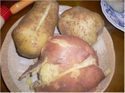 今日はパパは会議アンド飲み会のため帰ってくるのが遅くなってしまいました。日記のねたが無い・・・・・・・何を書こうかなぁ?そういえば、ジャガイモ掘りでもらってきたジャガイモを、先日食べくらべしました。赤っぽいのが「アンデス」、細長いのが「メークイン」まん丸なのが「男爵」です。ちょっと蒸しが足らなかったようで、中がちょっと硬かったけど、食べた感じはすべて違いました。アンデスは一番柔らかく、パサパサした感じ。話に聞くとサラダとかに合うらしい。そして一番実がしっかりしているのがメークイン。ホクホクしていたのが男爵でした。パパは味音痴なので味のはっきりした違いは良く分かんなかったけど、おいしく感じたのは男爵でした。こんどもう一度食べ比べてみよう!何て言ったってジャガイモたくさんあるから!!!