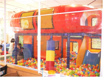 ここ最近お出かけしていません。昨日も遥人が調子悪かったので出かけられなかったし。さすがに家にいるのも飽きたということで、お出かけすることにしました。お出かけすると言ってもさてどこに行こうか?さんざん悩んだ末、東大和のけやきモールへ行くことにしました。ここには子供が遊べる場所があるレストランが最近出来たということで、行ってみたいって以前から思っていました。早速入ってみると中はこんな感じでした今日は雨が降っているにもかかわらず、結構空いていました。料金設定は子供一人300円二人目以降は150円(6ヶ月以上の子供から料金発生)。空いていれば結構リーズナブルかな?店に入ると早速遥人は遊具で遊び始めました。ボールが一面に敷き詰めてあって、しかも結構深い・・・でも遥人はボールを投げたり、ボールの中にダイブしたりして楽しそうでした。璃杏も中に入れて遊ばせて見ると、璃杏にはやはりちょっと深いようで、ボールの中に埋まってしまいます。遥人も璃杏もかなりたのしそうでした。天気が悪い日ってなかなか出かけるところに困っていたので、この金額ならこれから重宝するかもしれないなぁ?