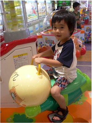 今日はとりあえず夏休みをもらいました。本格的な夏休みは来週もらう予定だけど、今日はとりあえずお休みです。今日は特に予定は無かったんだけど、買い物に東大和のイトーヨーカ堂に行きました。遥人もお小遣いを持って行きました。自分で好きなものを買いなって言ったら、ゲームセンターでアンパンマンの乗り物乗りたいって・・・このアンパンマンの乗り物は二人乗りで、アンパンマンとメロンパンナちゃんがいるんだけど、遥人は真っ先にメロンパンナちゃんに乗りました。そう、遥人はメロンパンナちゃんが大好きです。ということで璃杏はアンパンマンに乗っけました。このあと、コインゲームでたくさん遊んでポップコーン買って、カキ氷買って帰りました。
