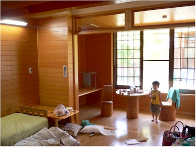 今日ははじめの予定では帰る予定だったんだけど、初日に雨でほとんど遊べなかったこともあり、もう1泊することにしました。泊まる場所も別の場所に移動しようかと考えたんだけど、移動してテント張ってということを考えると、結構時間がかかってしまうのでもう1泊このコテージに泊まることにしました。この部屋は空いていなかったんだけど、別の部屋に空きがあったのでその部屋へ移動です。今よりちょっと狭い部屋で、料金も8000円と安くなりました。冷蔵庫もキッチンも小さくて、風呂もユニットバスと良くないところもあったけど、基本的にはとてもよい場所です。さて、今日はとりあえず敷地の中にある池で水遊びです。池はあまりきれいではなかったけど、冷たくてとっても気持ちが良かった。このキャンプ場の敷地内にはウサギの森という名前だけにウサギもいます。遥人はウサギに葉っぱをあげたりしていました。キャンプ場の脇にお山の学校というところがあって、そこにはヤギや猿・孔雀なんかがいました。そこにある池には鴨がいて遥人は100円で餌を買って餌をあげたんだけど、その池にはニジマスが山ほどいて、餌を投げると鴨より先にニジマスが餌を食べてしまいます。それでも遥人はたのしいようで、結局3個も餌を買ってしまった・・・