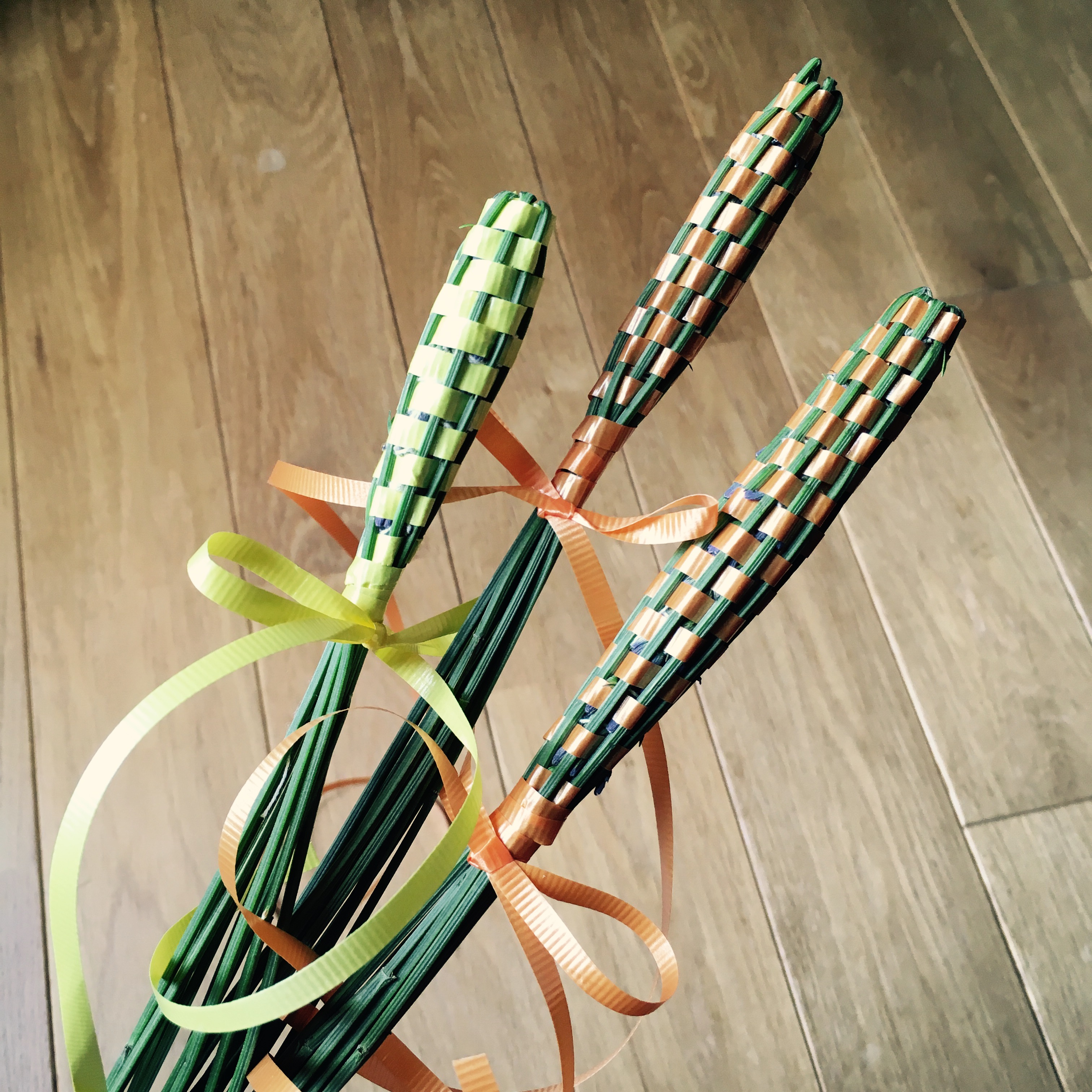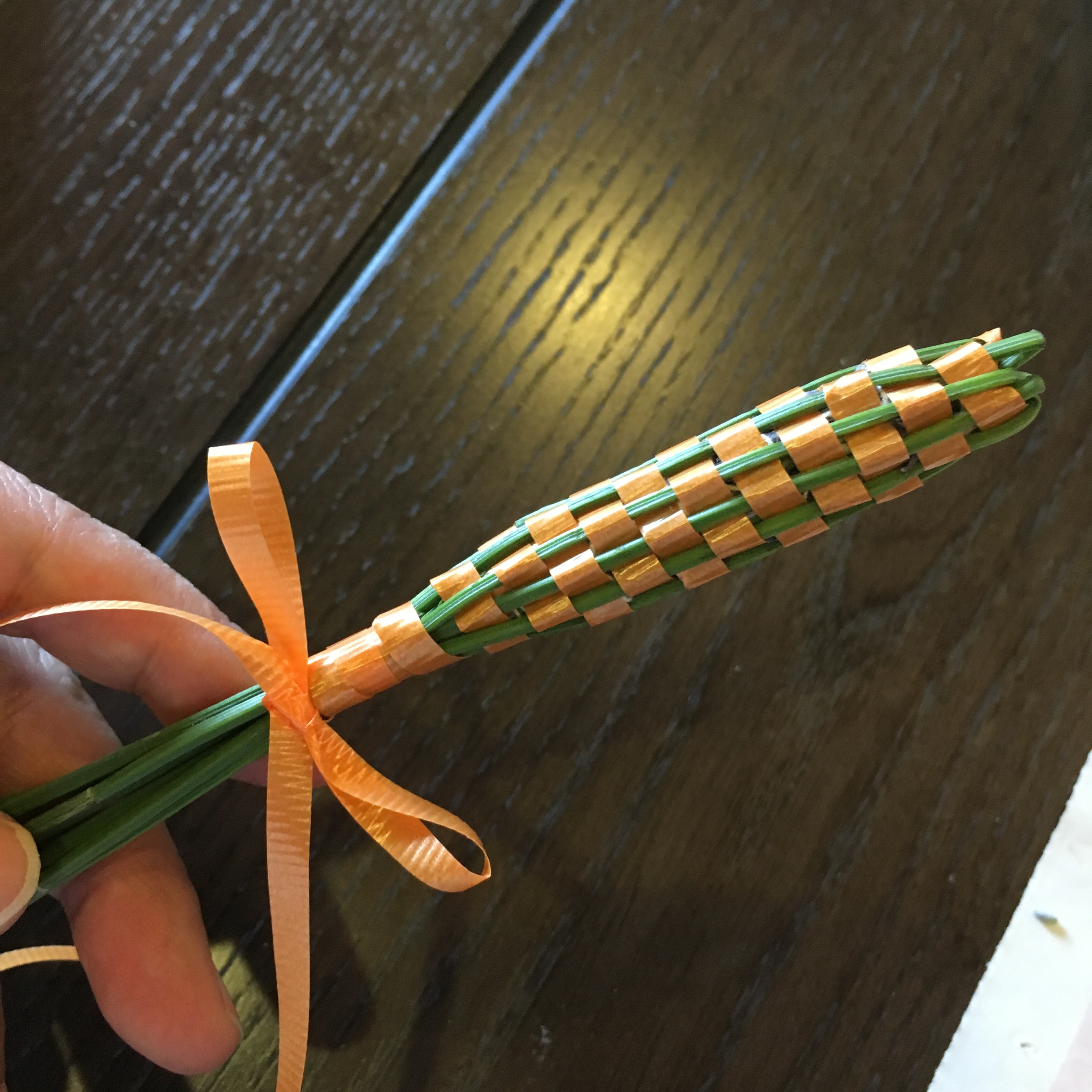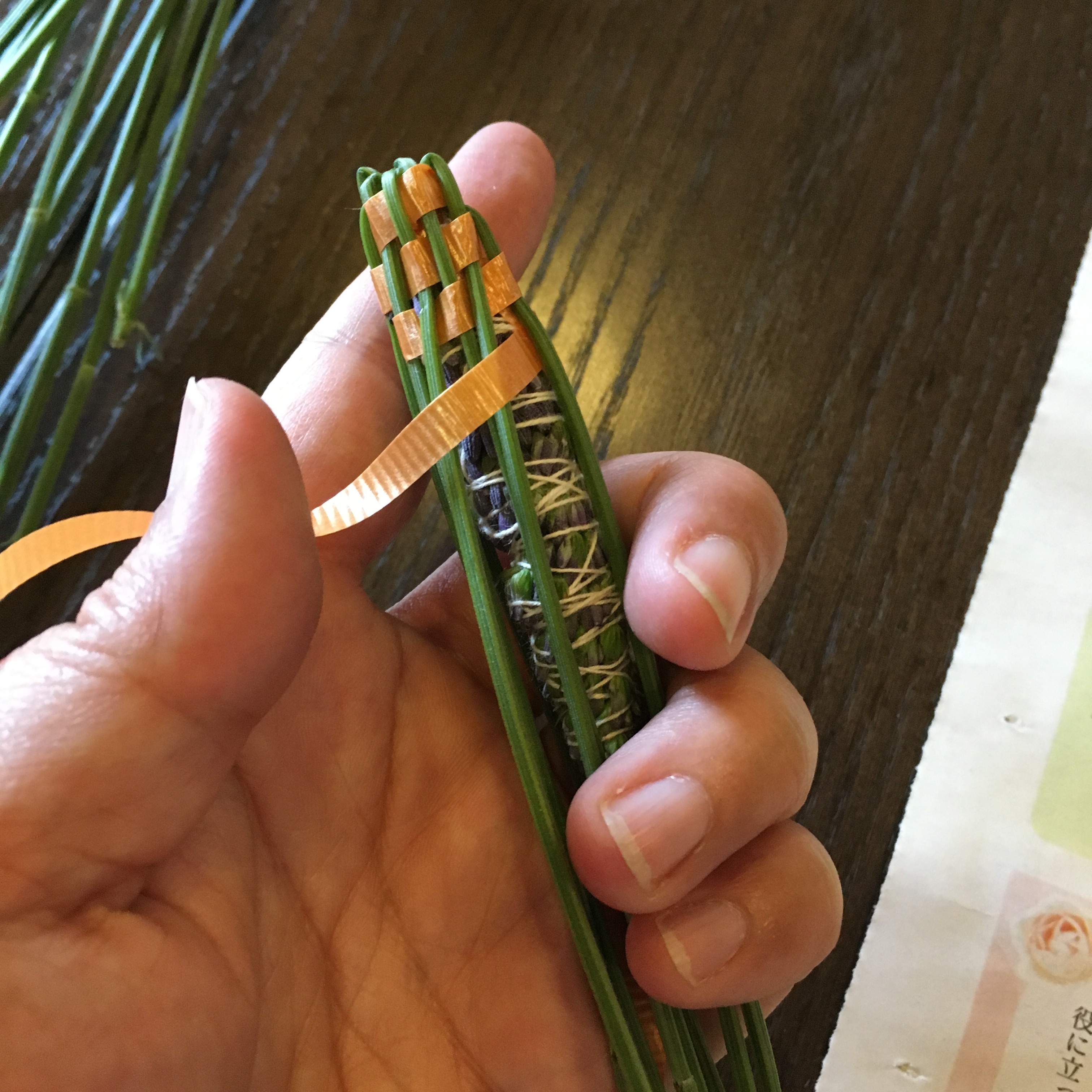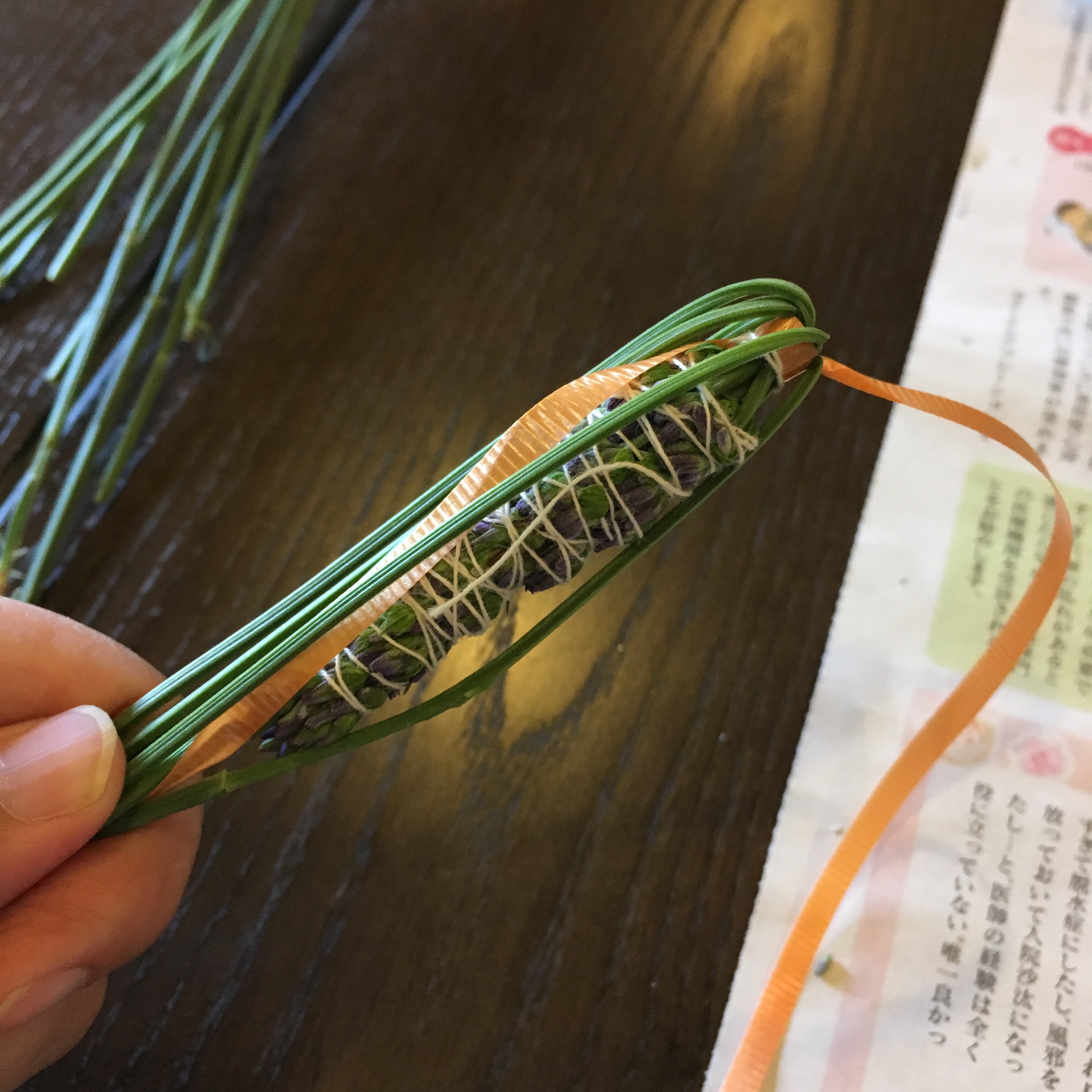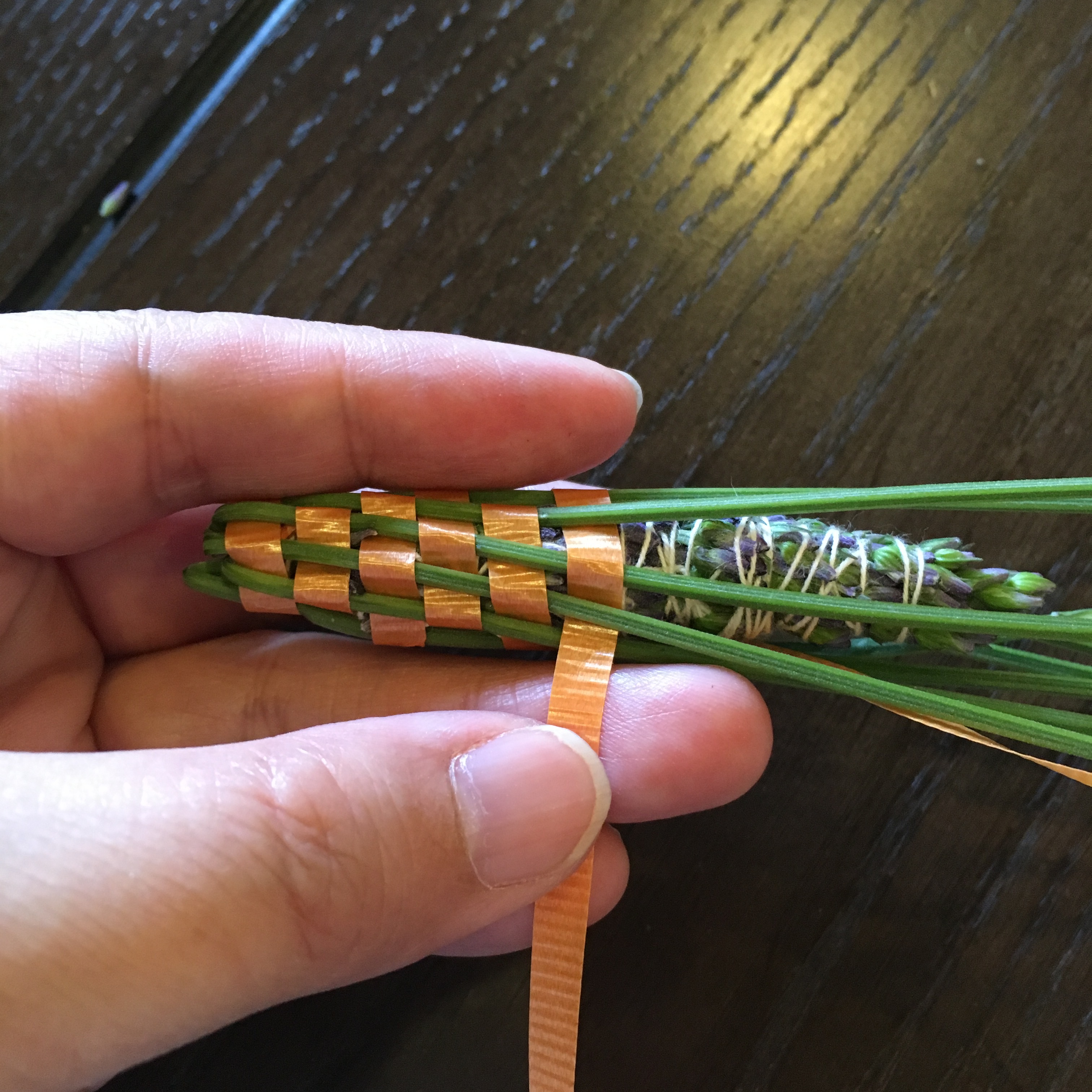 長い方のリボンを、茎を一本ごと飛ばして、茎の上、下、上、下、とくぐらせて編んで行きます。