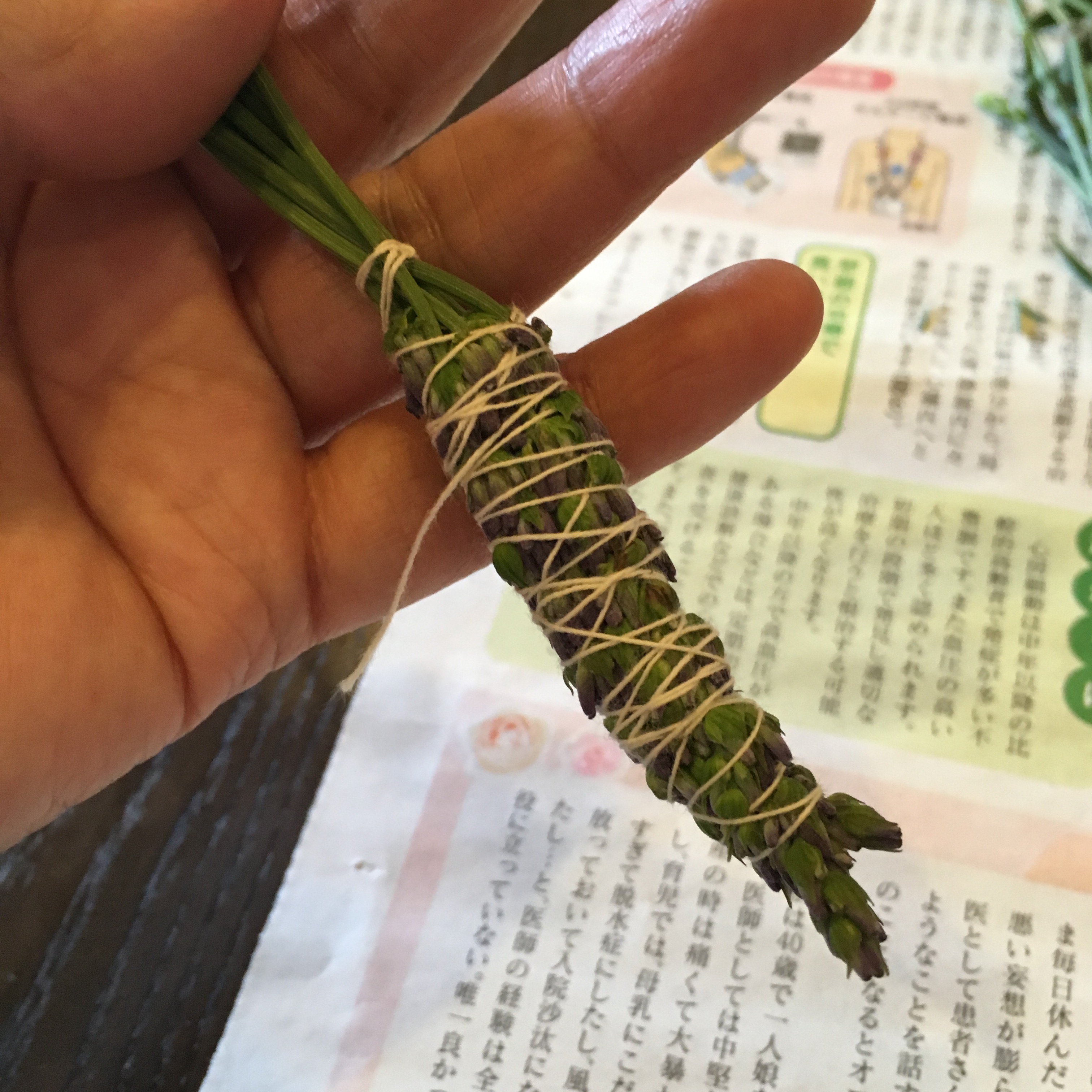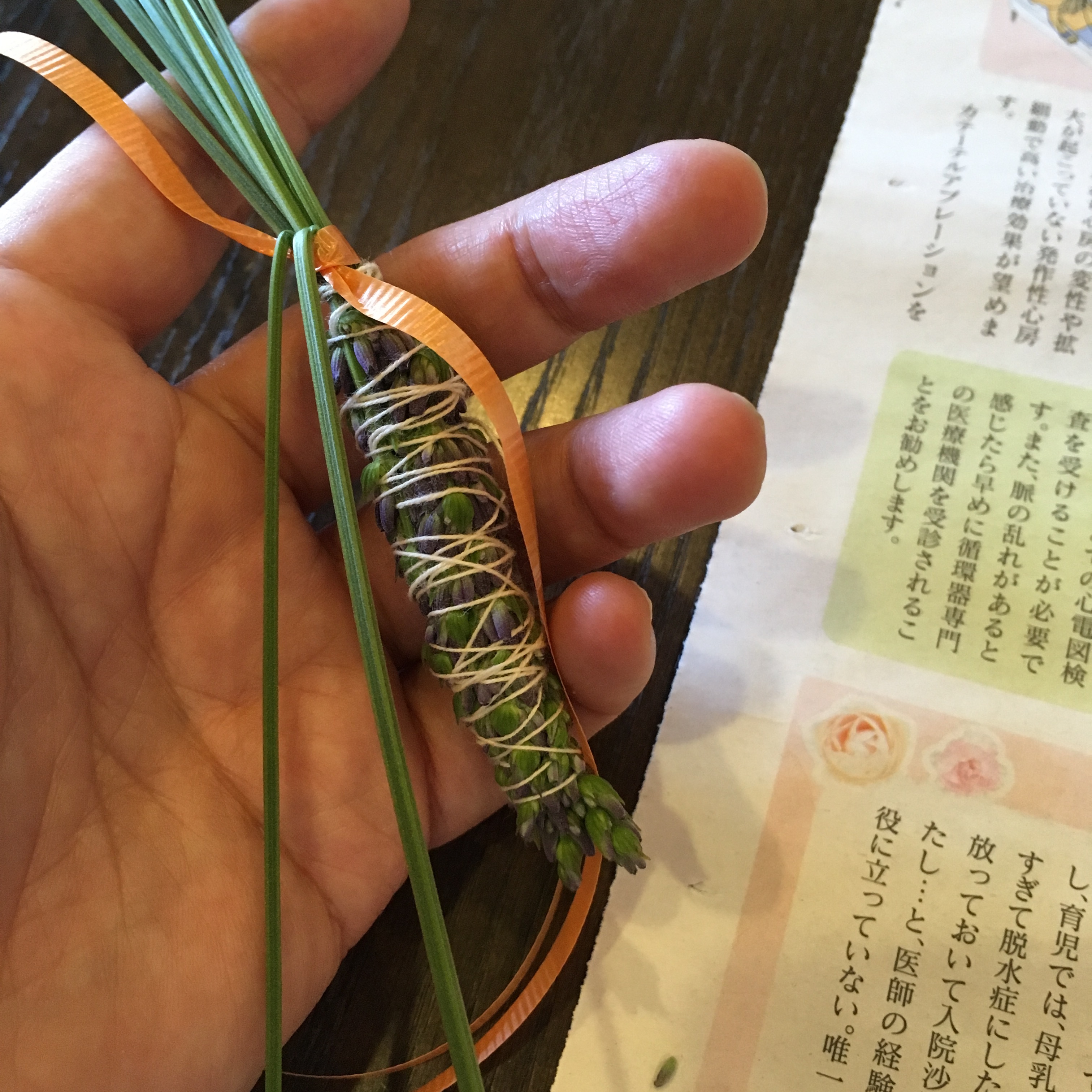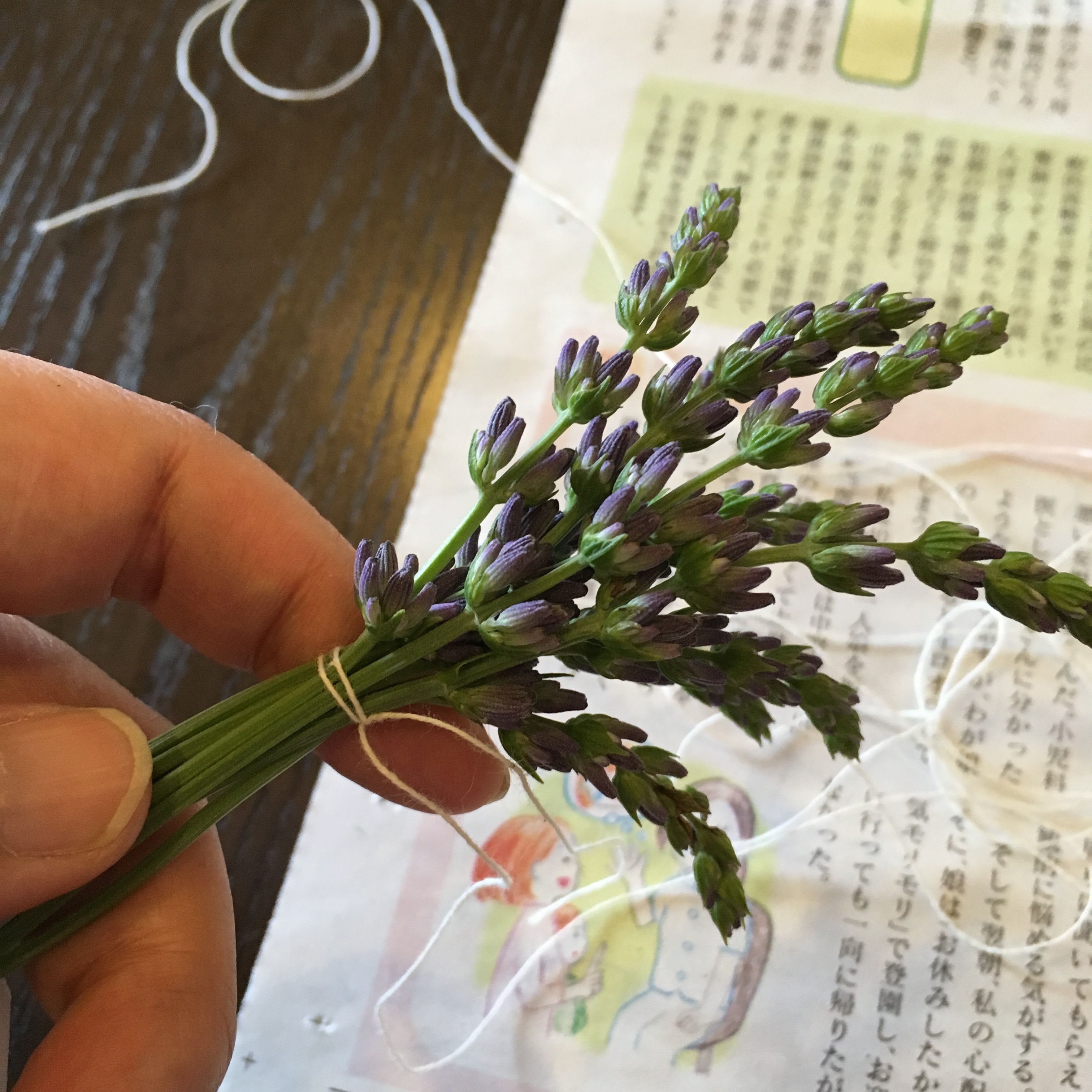 9本のラベンダーをそろえたら、花穂の首もとを糸で縛り、糸のあまりでそのまま花穂をぐるぐる巻いてしまいます。