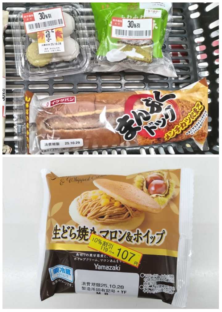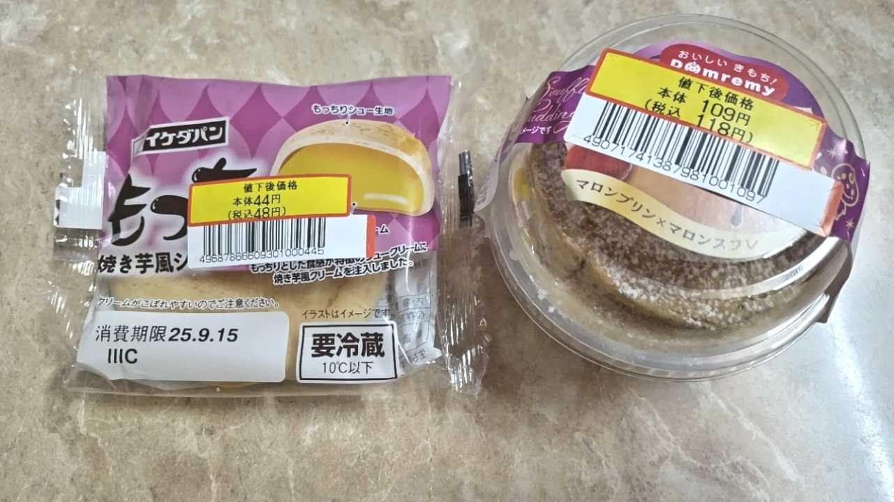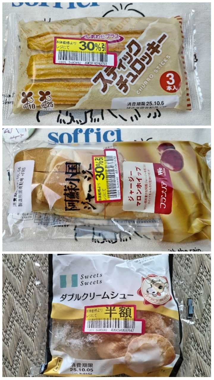 明日健康診断だから!割引品も控えめに3個です!!スティックチュロッキー好きー阿蘇ジャージーマロンホイップ栗うまーダブルクリームシューシュークリームはトートバッグの底まで沈んでいてお出かけから帰って存在を思い出しました…慌てて冷凍庫へ入れてすぐ美味しくいただきました!危ない危ない…