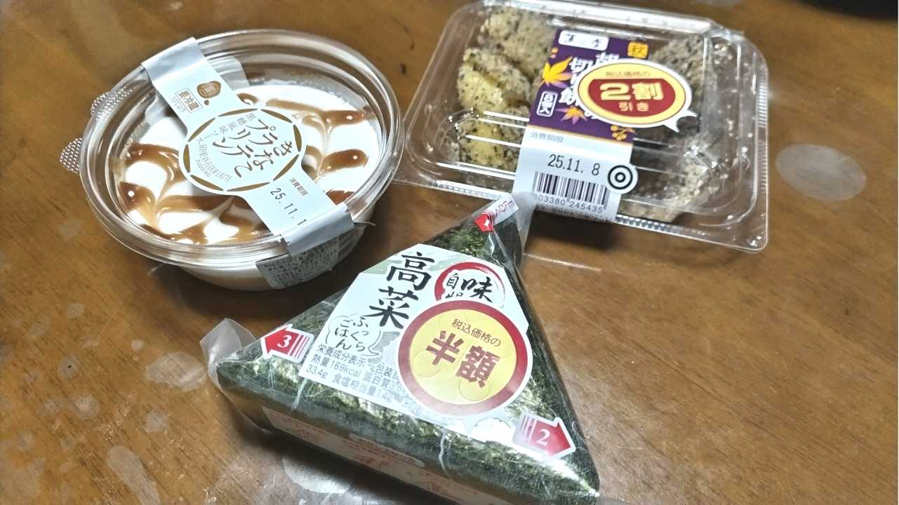 控えめだけどわがまま晩ご飯した!芋ごま切り餅¥96高菜おにぎり¥56きなこラテプリン¥79いや…広告の品ムーンライト¥117を買いに行ったら売り切れてた…のでついでに割引品でした…ブラックムーンは残ってたけど違うんだ…私はムーンライトが好きなんだ…と、ブルボンバタークッキー¥96を買って帰りましたとさ…