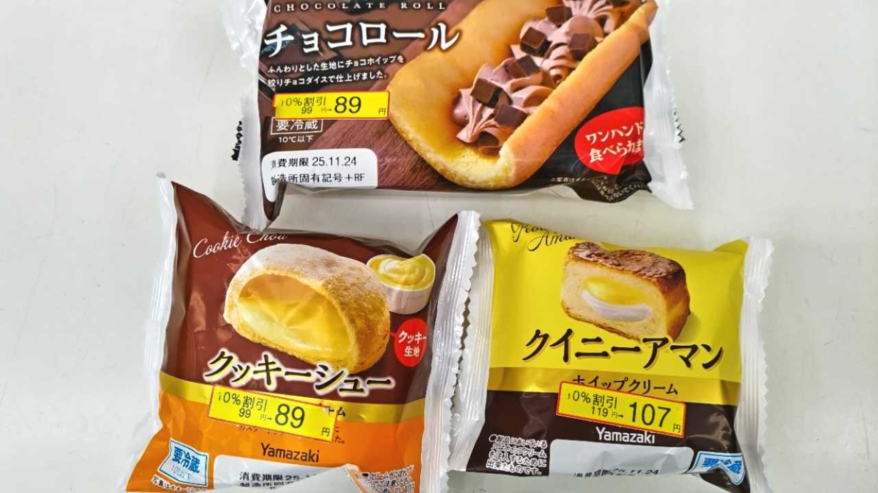 割引スイーツだー買わなきゃー☆チョコロール チョコブロックの食感よいー!クッキーシュー クッキー!うまー!クイニーアマン あまうまー!どれも美味しかった知ってる!
