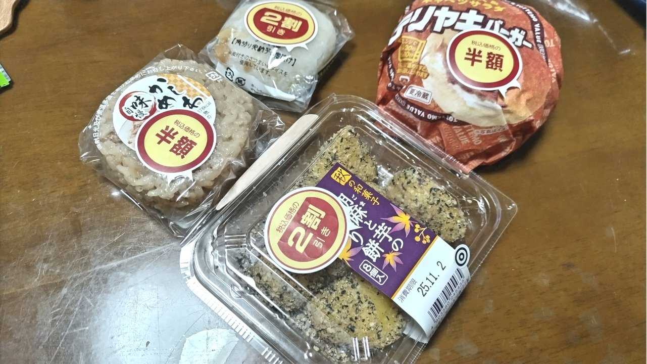 割引は買っちゃう人種…わがまま晩ご飯再び!合計¥272 !胡麻と芋の切り餅うま!芋大福うま!テリヤキバーガーうま!かしわめしうま!全部うまい!!楽しかった…栄養素考えない晩ご飯…
