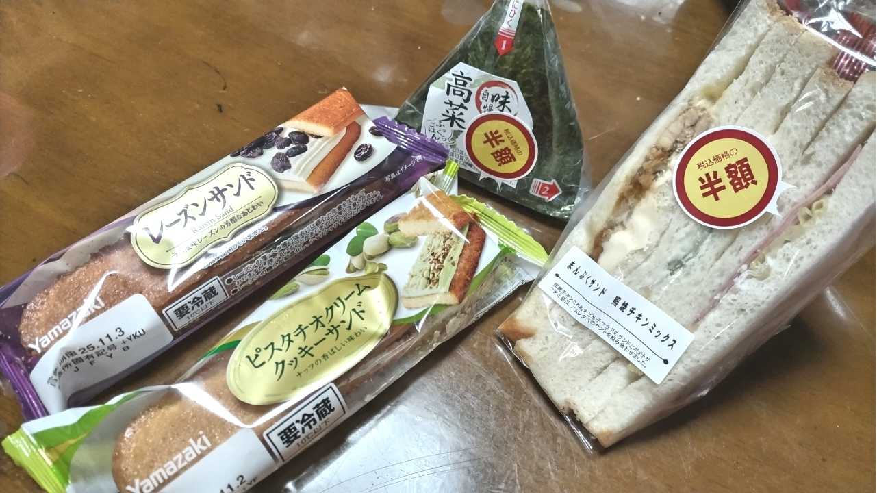 久しぶりに半額おにぎりとサンドイッチした!まんぷくサンド照焼チキンミックス¥125高菜おにぎり¥52ピスタチオクリームクッキーサンド¥98レーズンサンド¥98クッキーサンド…税込¥100以下だったのでつい…やっぱりレーズンサンド最強!