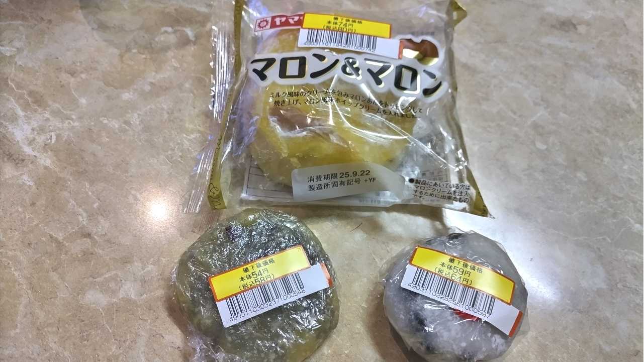 割引品ちょっと食べるよ!マロンマロン、芋団子、塩豆大福です!芋栗満喫!!いつでも美味しいけど、秋だとなお美味しいね!