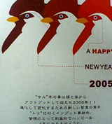 今年の最終日は、すがすがしい気持ちで穏やかに迎えることができました。読みかけの本や、読みたかった本を読んで、年賀状を書きつつ1年間のことを思い出します。毎年そうしているように昨年の大晦日の記録を参照してみる。・・・・・・・・・・・・・・・・・・・・・・・・・・・・・・・・・・・「低空ジャンプのサル(2004年)から “空に飛び立ったトリ(2005年)”」へと変貌を!こんなイメージで「自分の中のクリエイティブを磨く」ことに力を入れてきました。・・・・・・・・・・・・・・・・・・・・・・・・・・・・・・・・・・・・・うーん、足をバタバタさせてもがいてばっかりで、まだまだなんですが「守・破・離」でいうところの「守」のゴール地点が見えてきてそこから離陸をし始めたところだと思いたい。問題がたくさん勃発した年ではありましたが、ちゃんと乗り切りましたしね。怪我も大病もせずに、楽しくやれました。問題をこなしてきて、はっきり、うんざりするくらい実感できたこと「問題は事実にあるのではない。問題は事実の解釈にある。」とにかく、たくさんの人や出来事と出合って確実に変化できた1年でした。出合ったすべての人や出来事に向かって足を向けては眠れません。結構一人よがりな性格なんですがたくさん助けていただきありがとうございました。□思考のカケラ+ □キーワードblog!脳梁的喫茶空間□一日一枚画像ヲ記ス彩リメモblog!yanaichimob さて来年2006はどんな年になるか今夜いっぱい使ってイメージします。追伸今年も随分たくさんの劇場に足を運びました。やっぱり、「人間の生き方」と「劇場のあり方」には妙に共通点があって、少し哲学的になっちゃいますが、山ほど楽しいことを発見した1年間でした。「劇場があって劇が演じられるのではない。 劇が演じられると、劇場になるのである。 つまり、劇場は「在る」のではなく「成る」ものなのだ。(寺山修司)」皆様、よいお年を!