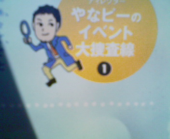 このblogでも何度か書きましたが、今年4月から某フリーペーパーにお薦めイベント情報コーナーを連載してましてそこに登場している梁瀬のバーチャルキャラクター《やなピー》のイラストがわれながら面白い。自分の手を離れて、キャラが別の人格をもってだんだんメタボリックになってることを発見した。なにげに面白かったのでここ4ヶ月の記録を画像でたどります。梁瀬のリアルを知っている人、笑ってください!!創刊号、《やなピーのイベント大捜査線》にふさわしく探偵ふう。 2号目、腕まくりして《探偵ふうに》メモを取る俺(の分身)アゴのラインがシャープ、まなざし鋭い。 3号目、あら、突然やる気がなくなって、太ってしまった俺(の分身)目がトロンとしている。どうも変だ。二の腕がぽちゃぽちゃしてる。この辺りからやなピーが一人歩きしだした。そして8月最新号。夏休みバージョンやっぱり目線が泳いでいる。(夏太り・・・、なぜか先月と同じ色の恥ずかしいシャツ)自分の分身ながら《どうした?やなピー》と思わずにはいられなかったので記録しておきます・・・・・。