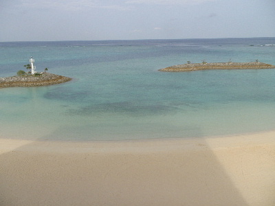 今回の旅行、天気予報は最悪でした。滞在日全部が曇りのち雨、降水確率は60%~90%。天気予報では晴れ間はほぼ期待できません。2日目の朝、予報どおり曇りだったのですが、時間が過ぎるにつれて少しずつ晴れてきました。ビーチにホテルの影が現れました!一日も晴れ間に会えないかもしれないと心配していた私と妻の喜びは大きいものでした。予報が悪かったので、晴れ間が見えるだけでもとてもラッキーです。私たちはホテルに隣接しているビーチへ散歩に行きました。もしかしたら、晴れ間は今日一日だけかもしれません。晴れているうちに沖縄の青い海を堪能しないとね。ビーチから突き出ている散歩用の通路を歩きます。所々が橋になっています。橋から下を見ると、なんと沢山の魚の群れが!写真にはあまり綺麗に写っていませんが、グレーっぽく影のように見えるのは、全部魚です。100匹あまりは居たでしょうか。全長25センチぐらいのフグに似た魚でした。魚たちは穏やかな波に身を任せて、のんびりと漂っています。南の島らしい、あくせくしない魚だなぁと思います。こんなのもいました。ウニです。ビーチの砂浜は白くてとても綺麗です。よく見てみると、全部、貝とか、サンゴのかけらでできているのです。関東地方の海の砂は石が細かくなったものです。南の島の海の砂は材料から違うのですね。白いのだけでなく、赤、ピンク、紫など鮮やかな色も時々混じっています。生物の気の遠くなるような営みがこの海を作っているのですね。ビーチを後にして私たちは今日のメインの目的地である、「美ら海水族館」に出発しました。車で走っている途中に「万座毛」の案内が目に入ったので、よってみることにしました。ここは象の姿に似た岩で有名です。こんな感じです。海の色はホテルのビーチよりも青が強いです。紺に近い鮮やかな青色です。海の色は海底の色によってさまざま変わります。貝殻やサンゴのかけらでできた白い砂のところはエメラルドグリーンですし、サンゴ礁でできたところは青っぽい色をしています。万座毛には、台風で運ばれたという、家のような大きさの岩が3つほどあり、自然の脅威を思い知らされます。こんなのがゴロンゴロン運ばれるのだから、人間なんてひとたまりもないです。途中の道で、妻がお気に入りの「ザ・ブセナテラス」という高級リゾートホテルを通りかかりました。妻は入りたがりましたが、私はちょっと尻込みしてしまいました。だって、宿泊客なわけでもないし。「お茶しにきたって言えば大丈夫だよ」という、妻の言うとおりに、ホテルの入り口のゲートの係員にたどたどしくその旨を伝えると、あっさり通してくれました。ブセナテラスの眺めはこんな感じ。ホテル内は南の島らしく開放的な雰囲気です。従業員は洗練されており、接客も良く、さすが高級ホテルという感じです。ホテルのビーチはこんな感じ。この写真の道は、ホテル内の施設をつなぐ(と思われる)おしゃれな無料バスが時々通ります。ビーチ沿いの道にはハイビスカスが生垣になっております。ハイビスカスって花屋ぐらいでしか見たことがなかったですが、沖縄のハイビスカスは地元だけあって、生き生きしてます。年中あたたかで、綺麗な海を見て、美しい花を見る。沖縄の人が長生きする理由がわかる気がします。それからブセナテラスの喫茶店でお茶をしました。焼きチーズケーキ、おいしかったなぁ。しかし、高級ホテルでお茶をしていると、なんだかとても癒されます。時間がゆっくり流れます。あくせく生きていることが本当に人生にとってベストなのか考えさせられます。考えてもいいし、考えなくてもいい。パートナーと一緒に、ゆったりした時間を楽しむ。こういうのが夢でした。
