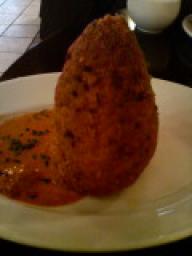 昨日の「これ、な~んだ?」。 正解はチーズリゾットのコロッケでした。 リゾットといってもべチャべチャせず、 でもやっぱりただのライスではなくリゾットだった。 チーズがたっぷり入って、なかはしっとり、 外のコロッケの衣は堅めでパリって感じ。 美味しかったけど1個丸々は多め。 お友達に他の物をオーダーしてもらって、 シェアしながらいただくとグー!