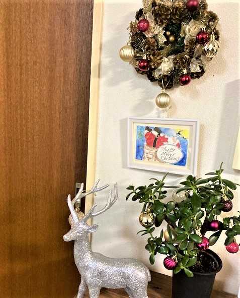 狭い我家のささやかなクリスマス飾りですリースと金のなる木にダイソーのオーナメントを飾り銀ラメのトナカイさんのオブジェを置きましたそして、居眠り中のサンタさんの絵を描いてみました少しはクリスマスらしくなりました週末は、久しぶりの対面の会議がありましたホテルの宴会場です広い会場に少人数で、ソーシャルディスタンスばっちりでした