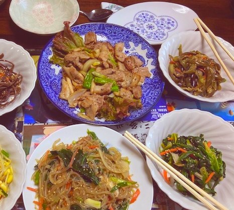 サムギョプサル、チャプチェ、チジミ、韓国風サラダ、わかめスープなど、