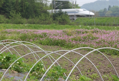 こんばんは、5月も10日になりました。ほんとに早いーー結婚記念日を迎えました。何回目になるのか、、まーさんも知らんそうです。計算したら35回目のようだけど、よっぱーなので、正確に計算できないデス。お昼はまーさんが食事に連れて行ってくれました。覚えていたのね、良い事です。いつものラーメンでもなくうどんでもなく豪華にいただきました~会席料理でしたから、次の料理が来るまでの間がもてないコト。。。。。。さて、今日の鉄です。イチゴの花が咲いてましたよ。れんげも咲いても麦も青々としてまさに5月。一番過ごしやすい時期ですね。昨日は神社にも行ってみましたそういえば桜の頃もでかけたのでした